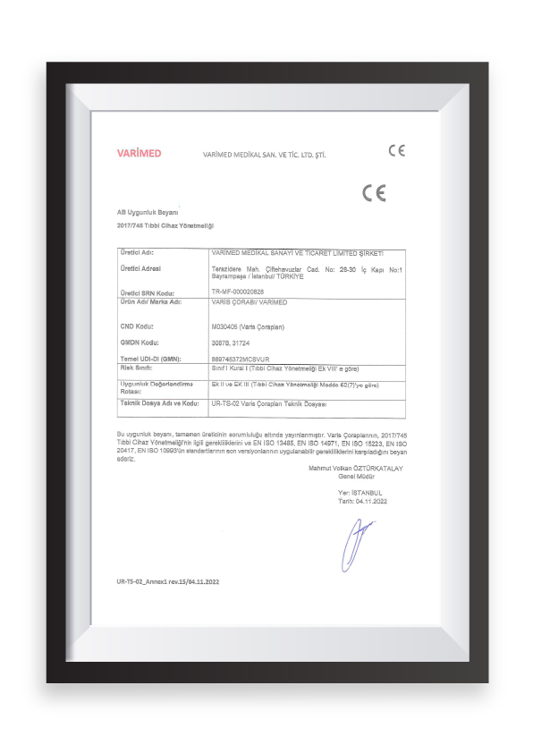 Varimed varis çoraplarında kullanılan mükemmel elastikiyete sahip çift kaplamalı iplik özelliklerinden dolayı elastikiyet ve esnekliklerini uzun süre koruma özelliğine sahiptir.